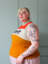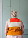 The body of the pattern is made with 2 ‘main colours’ bordering an off-white stripe for ‘branding’ across the chest. For a super nice true vintage aesthetic, the ribbing is worked in stripes using the off-white and a contrast colour. Of course, it is totally ok to use any colours you wish, but I highly recommend using off-white, white, beige, super light, or undyed yarn where off-white is indicated for best design effect. You are welcome to change colours wherever you would like, but instructions are given for your off-white stripe to be proportionally fit to your body from bust apex to 4 rows before the zipper.