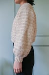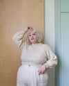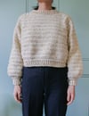 I used a large variety of yarns in development for this pattern. I’d recommend aran or worsted weight, but it can be made holding a strand of double knit with a strand of mohair or 2 strands of double knit for a nice bulky weight, or even one strand of double knit for a lighter, less opaque version! Using less springy fibres like cotton will make a heavier, more drapey jumper with looser looking tension, and using more lightweight fibres like acrylic and wool will make a tighter looking jumper with more of a dramatic silhouette!